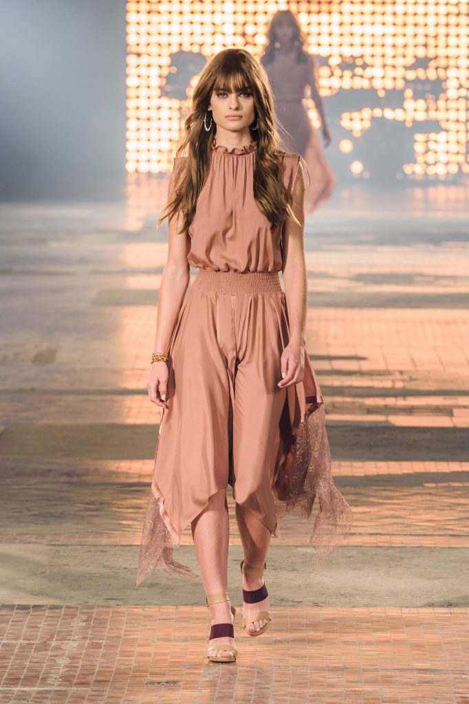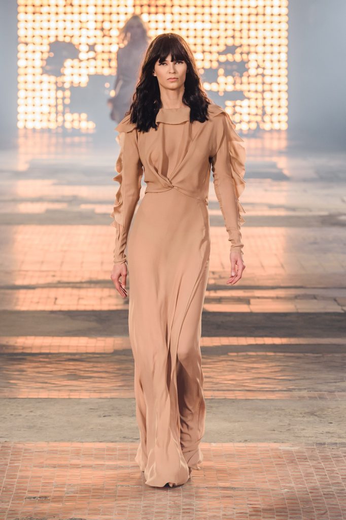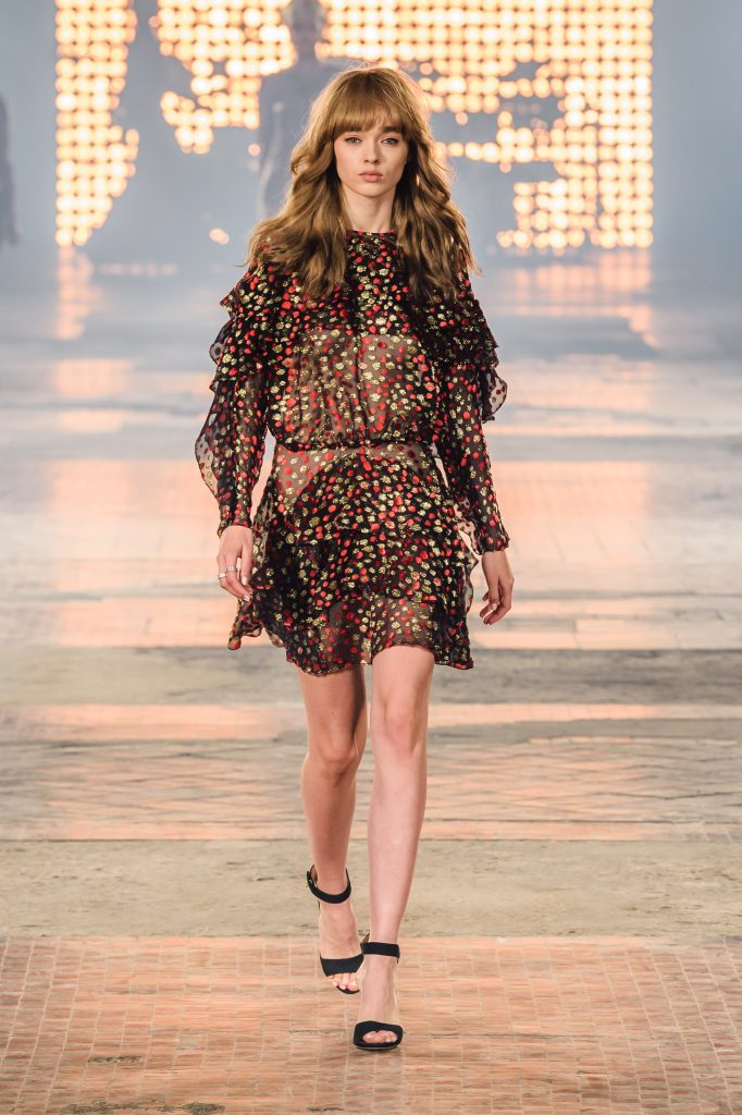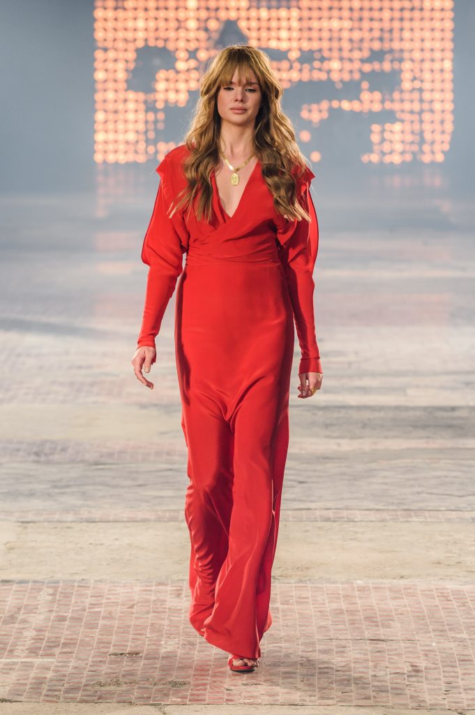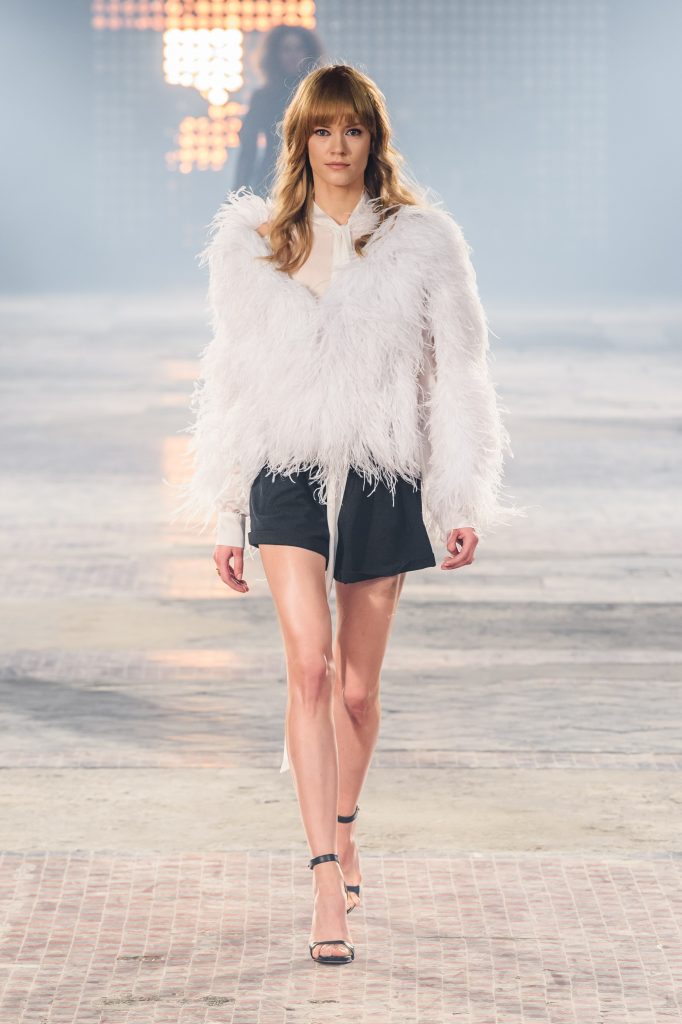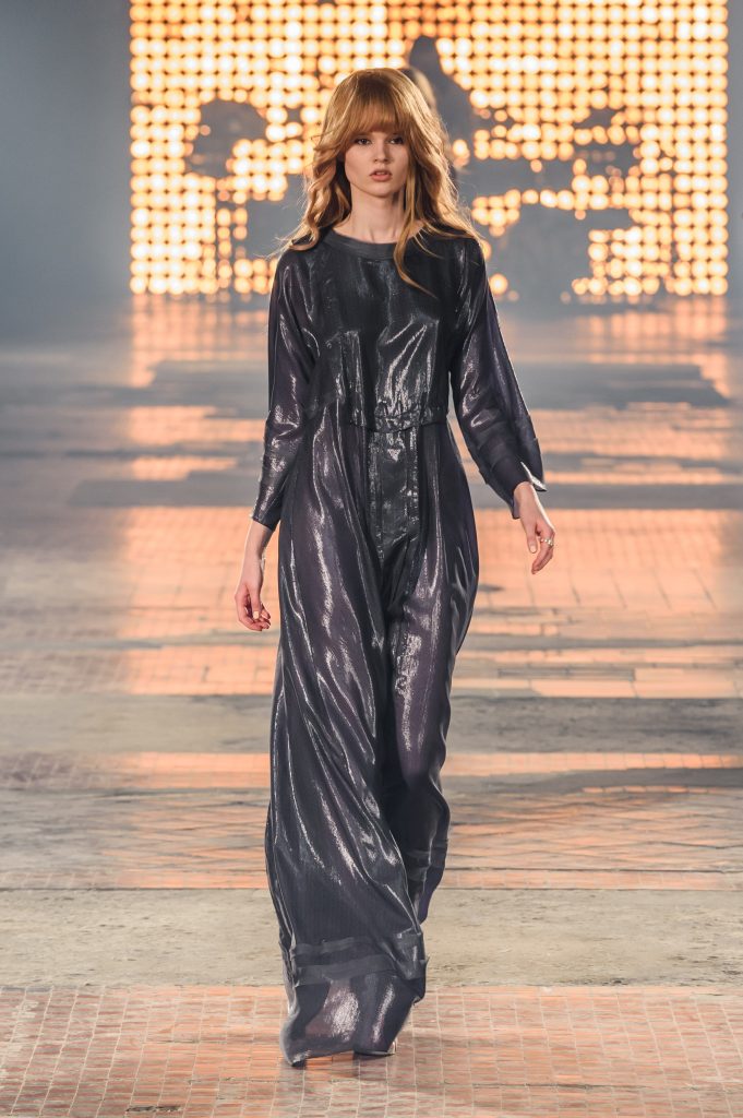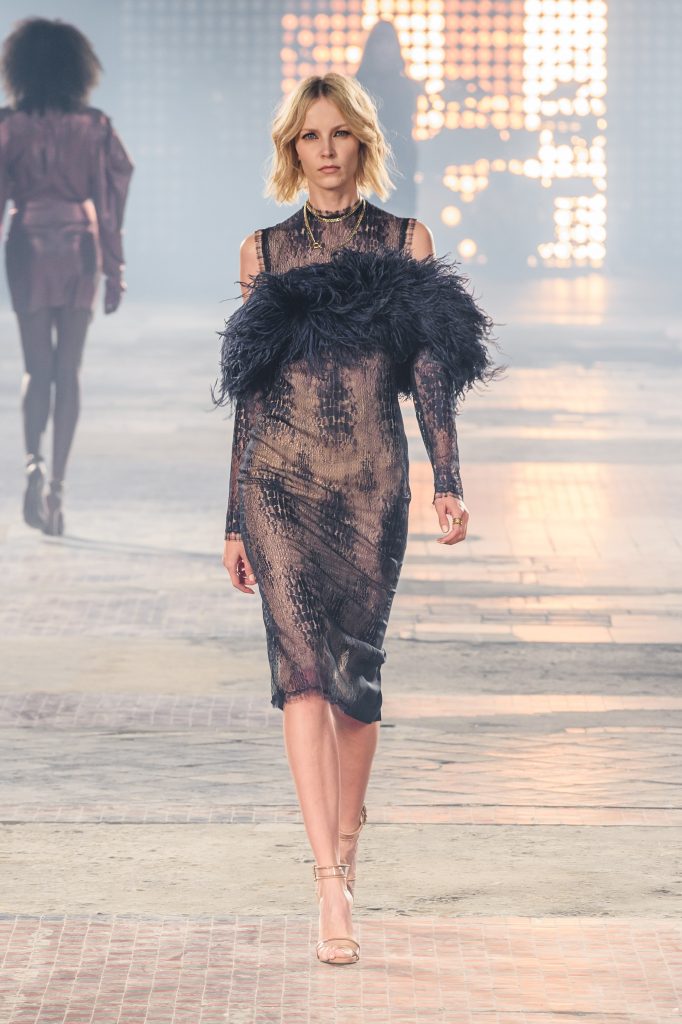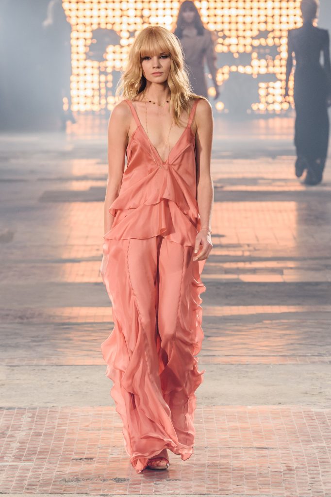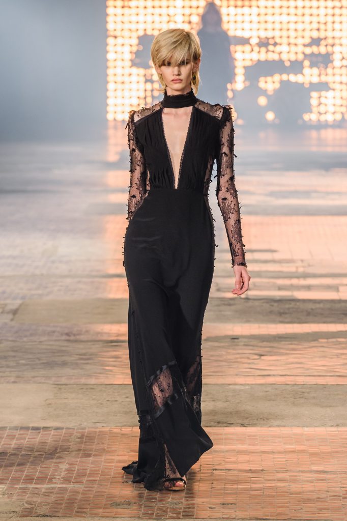 Zaprezentowana kolekcja to przede wszystkim szlachetne tkaniny, takie jak muślin czy jedwab. Wśród sylwetek dominują koronki, które wykorzystane zostały również jako zmysłowe detale oraz plisy charakterystyczne dla lat 70. i printy, takie jak wzór monstery czy krokodyla. Zaskakującym elementem kolekcji są pióra, które stanowią interpretację modnych w tamtych czasach futer.