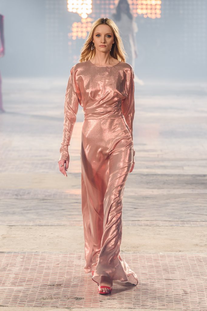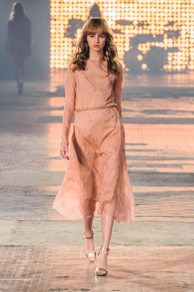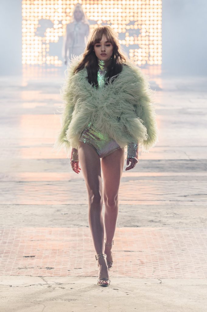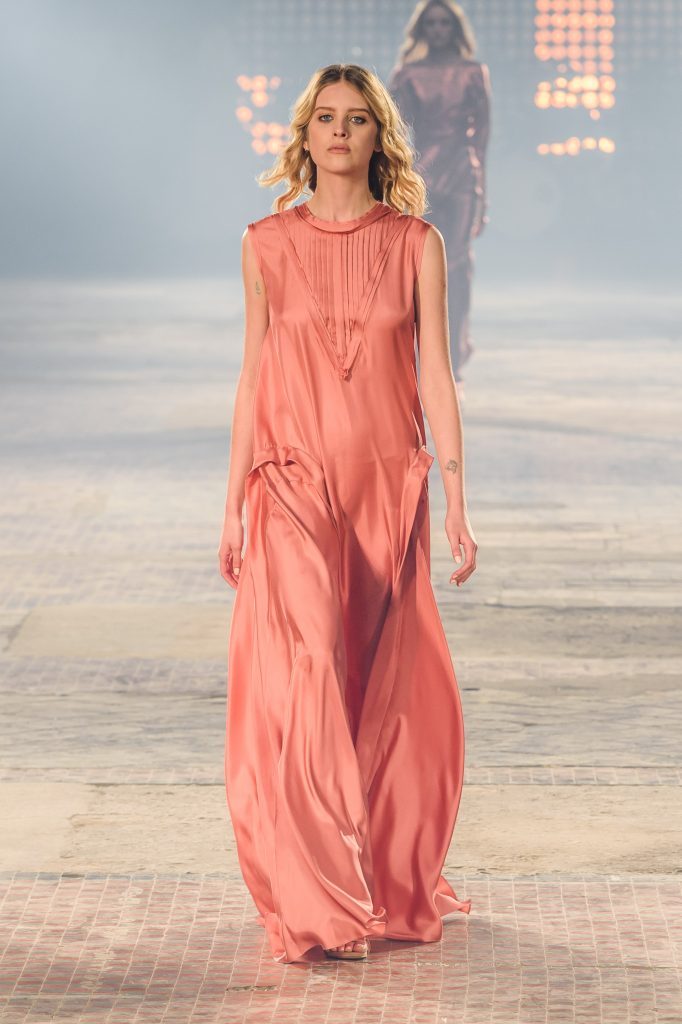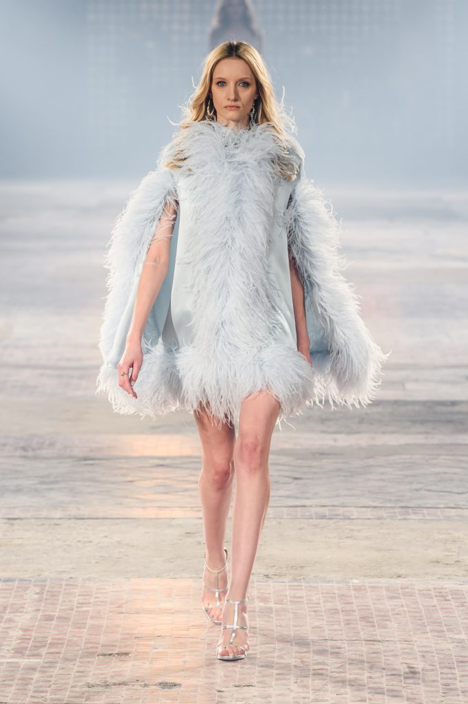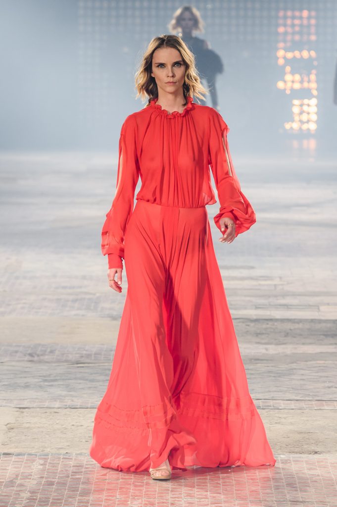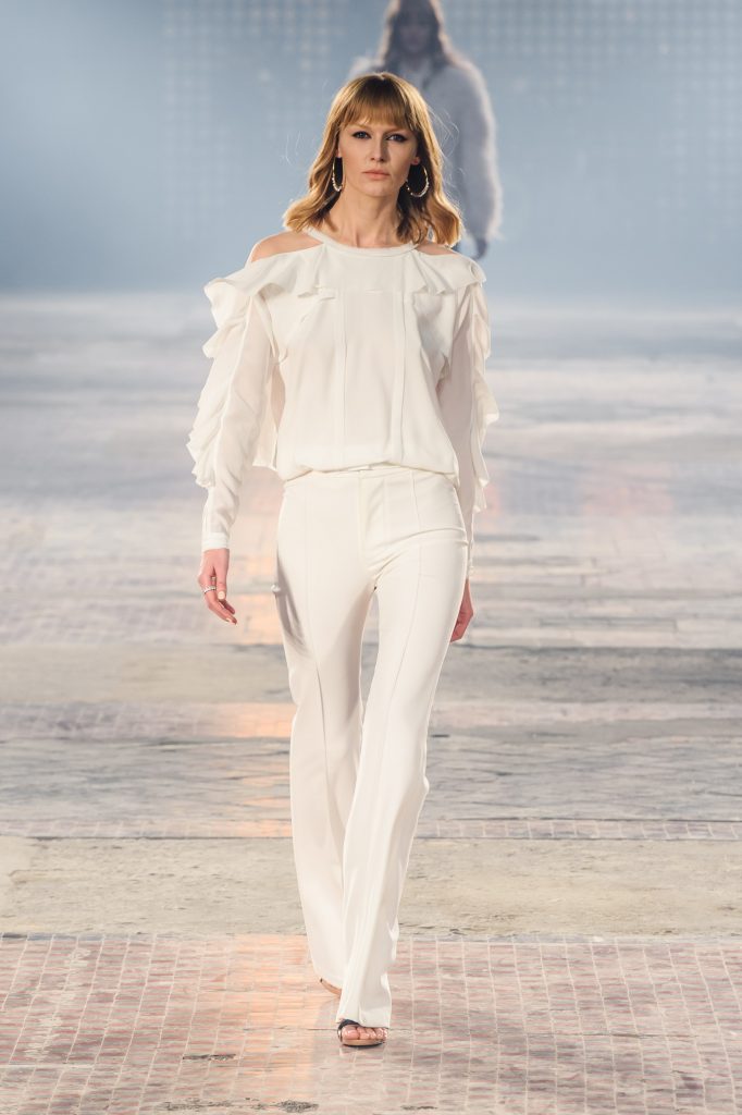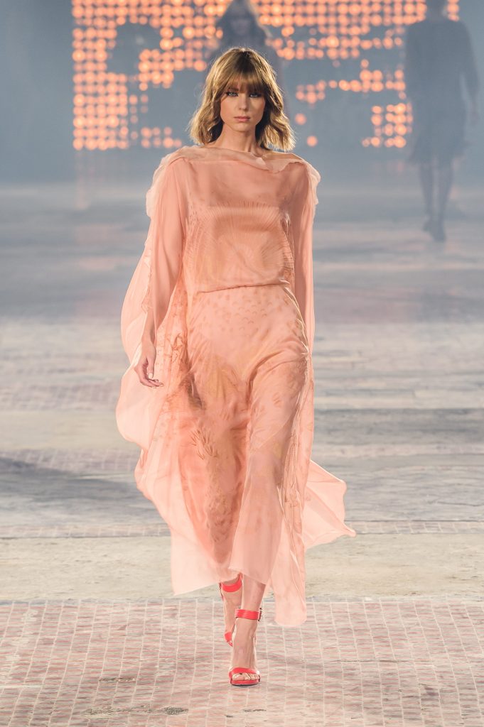 Zaprezentowana kolekcja to przede wszystkim szlachetne tkaniny, takie jak muślin czy jedwab. Wśród sylwetek dominują koronki, które wykorzystane zostały również jako zmysłowe detale oraz plisy charakterystyczne dla lat 70. i printy, takie jak wzór monstery czy krokodyla. Zaskakującym elementem kolekcji są pióra, które stanowią interpretację modnych w tamtych czasach futer.