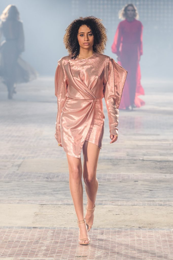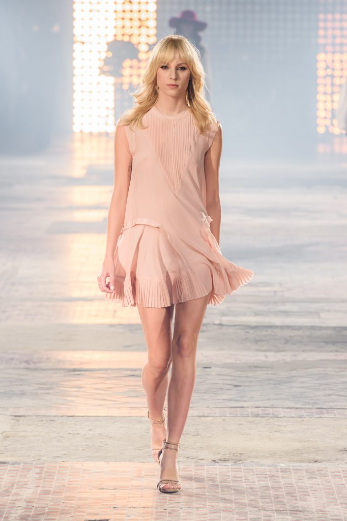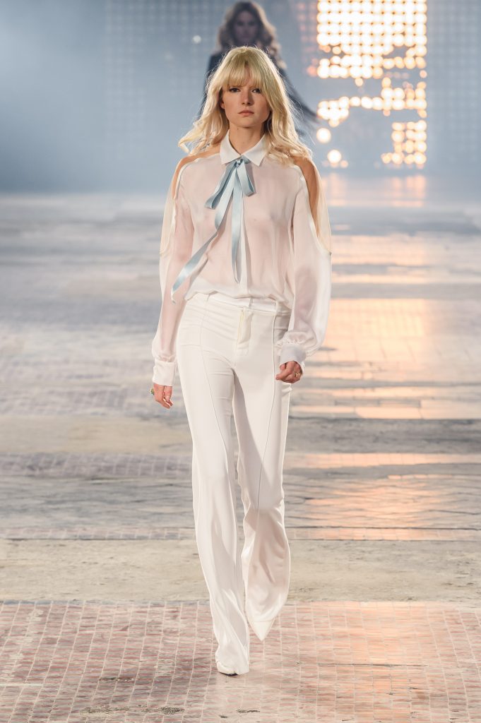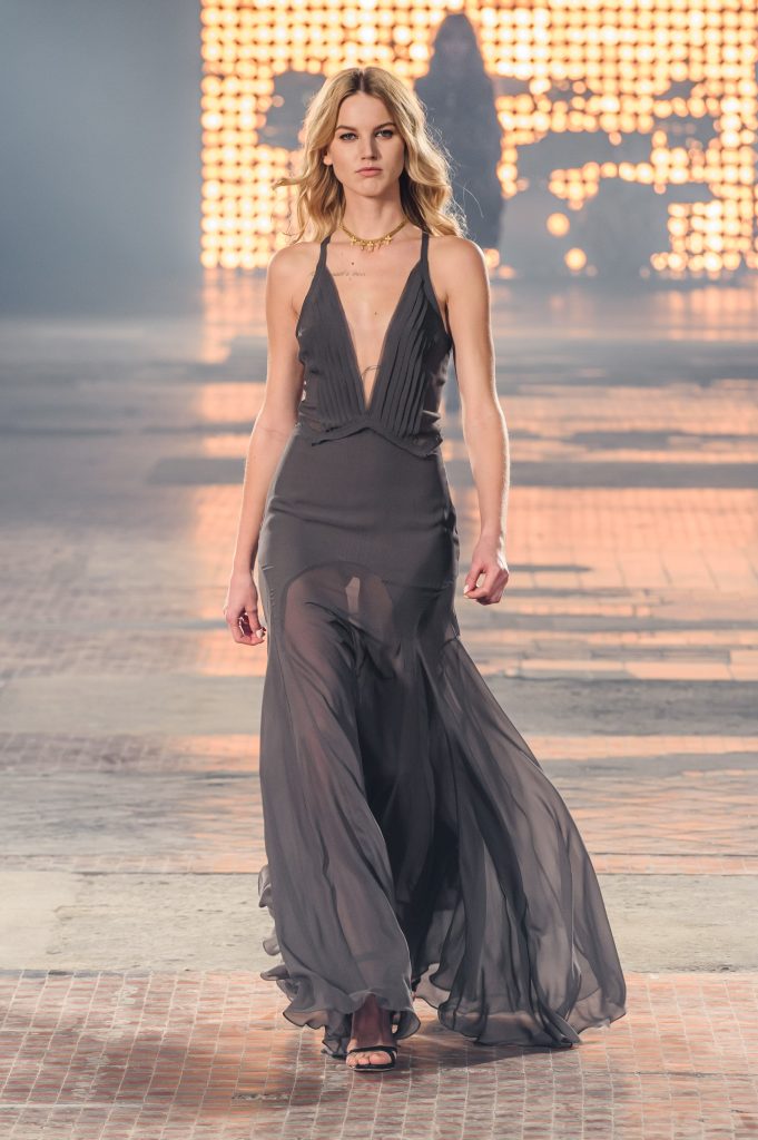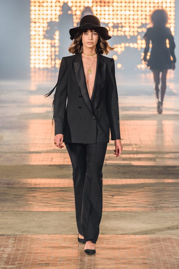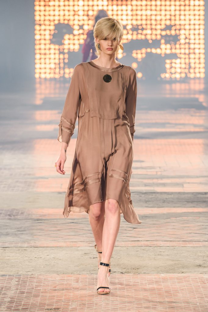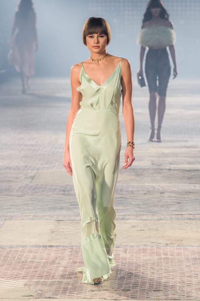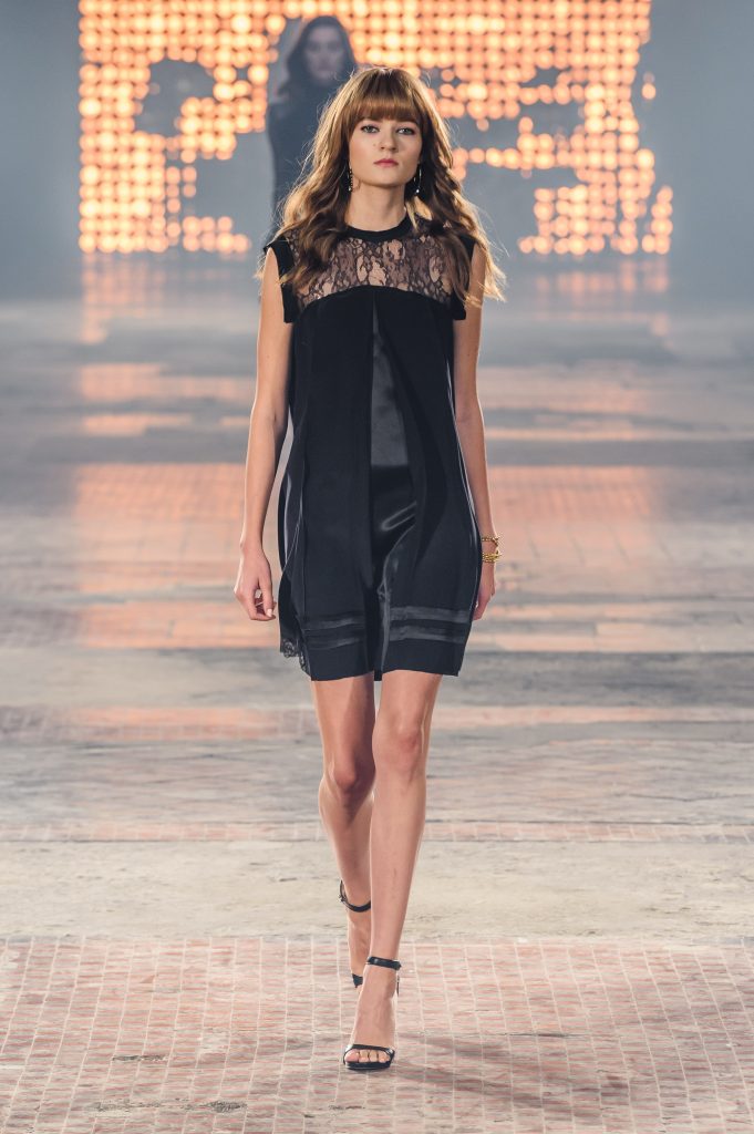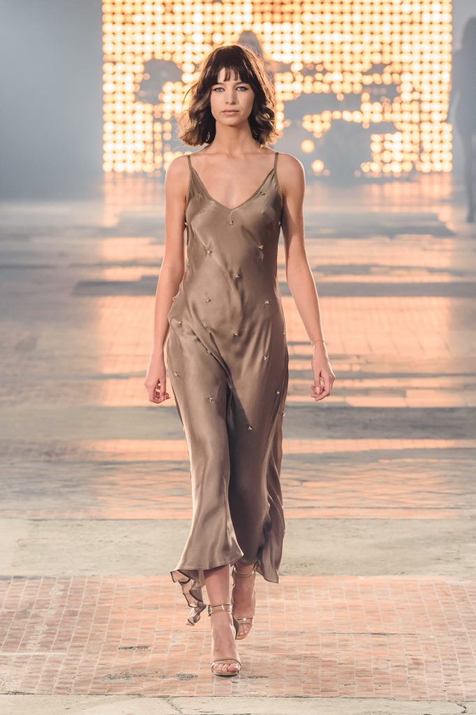 Zaprezentowana kolekcja to przede wszystkim szlachetne tkaniny, takie jak muślin czy jedwab. Wśród sylwetek dominują koronki, które wykorzystane zostały również jako zmysłowe detale oraz plisy charakterystyczne dla lat 70. i printy, takie jak wzór monstery czy krokodyla. Zaskakującym elementem kolekcji są pióra, które stanowią interpretację modnych w tamtych czasach futer.