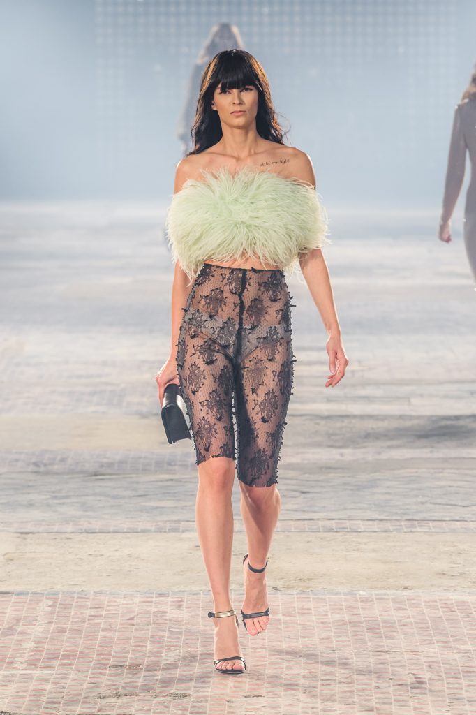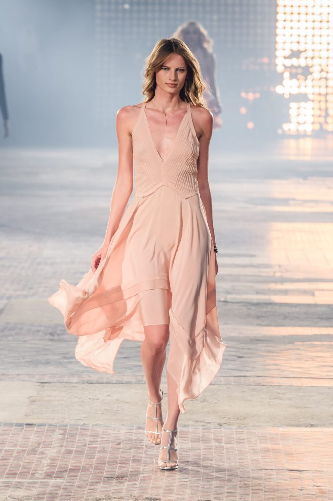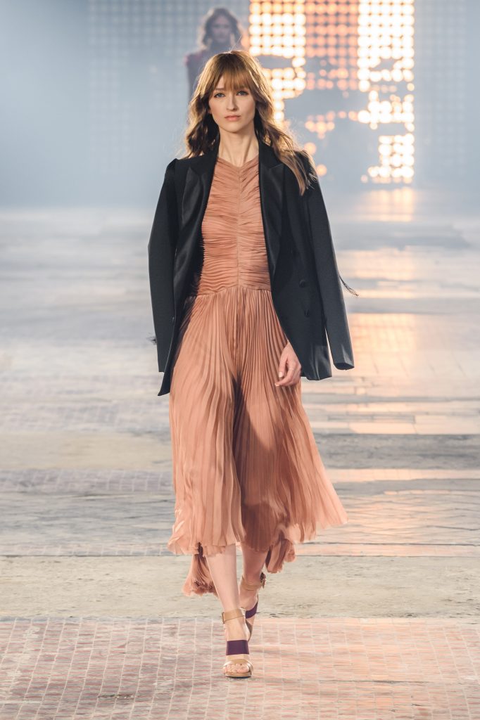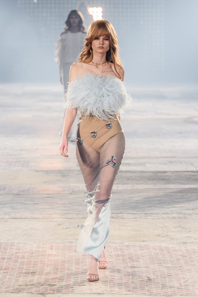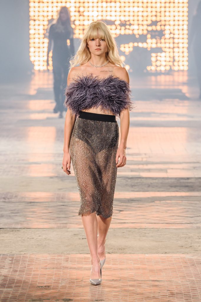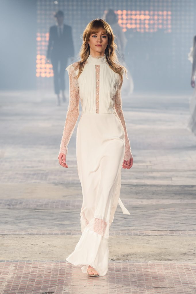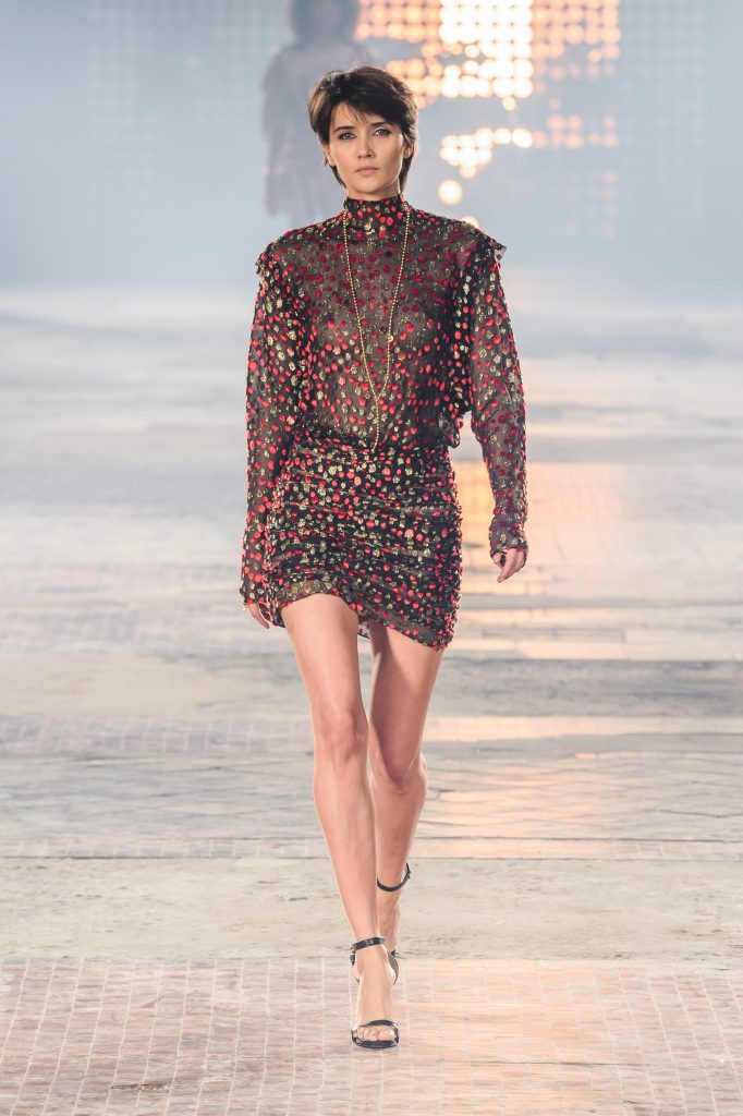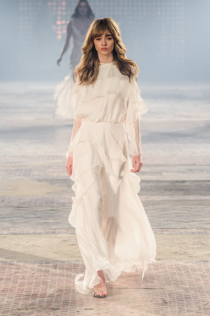 Zaprezentowana kolekcja to przede wszystkim szlachetne tkaniny, takie jak muślin czy jedwab. Wśród sylwetek dominują koronki, które wykorzystane zostały również jako zmysłowe detale oraz plisy charakterystyczne dla lat 70. i printy, takie jak wzór monstery czy krokodyla. Zaskakującym elementem kolekcji są pióra, które stanowią interpretację modnych w tamtych czasach futer.